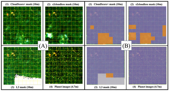 Example of a visual inspection of a moderate cloud cover block (ID = 13,020): Panel (A) shows mosaics of the evaluated masks: (1) CloudScore+, (2) s2cloudness, (3) L3, and (4) Planet reference image for comparison. Panel (B) shows the results after visual inspection, with “clear” pixels colored purple, “cloudy” pixels colored orange, and “no data” pixels colored gray.
