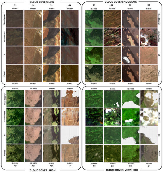 Visual examples of cloud detection results under varying cloud cover conditions (low, moderate, high, and very high) for CloudScore+, s2cloudless, and L3 algorithms. This figure is divided into four quadrants, each representing a specific cloud cover level. Within each quadrant, individual 1 × 1 km blocks are ordered from left to right according to the accuracy quartiles of the L3 mask, with the leftmost column showing the highest accuracy quartile (Q1) and the rightmost column representing the lowest accuracy quartile (Q4). Rows correspond to the evaluated masks (top to bottom: CloudScore+, s2cloudless, L3) and PlanetScope imagery as ground truth. Errors (clouds) are displayed as white areas, while “no data” pixels appear as large gray grid patterns. The spatial locations of these blocks are indicated in Figure 3 by yellow stars.