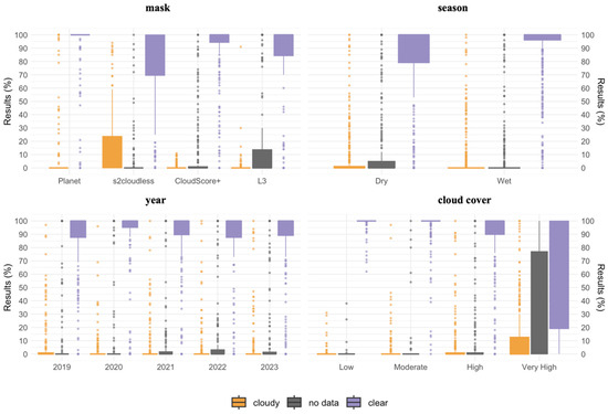 Box plots showing percentages of success (“clear”) in purple, errors (“cloudy”) in orange, and “no data” in gray for the one-way factors analyzed: (top left)—mask, (top right)—season, (bottom left)—year, and (bottom right)—cloud cover.