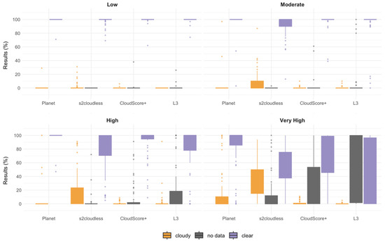 Under high cloud cover conditions, statistically significant differences between masks emerged, affecting both “clear” and “cloudy” pixels, particularly for Sentinel-2 masks, where the proportion of “no data” is also relevant. In terms of “clear” pixel success rates, no statistically significant differences were observed between Planet and CloudScore+ under both high and very high cloud cover conditions. Planet achieved success rates of 98.35% and 82.66%, respectively, while CloudScore+ reached 90.12% and 70.52%. Although Planet displayed slightly better performance, these differences were not statistically significant. L3 showed intermediate performance, with “clear” pixel success rates of 80.44% under high cloud cover and 43.45% under very high cloud cover. Conversely, s2cloudless had the lowest performance, with “clear” pixel success rates of 70.14% under high cloud cover and 53.25% under very high cloud cover.