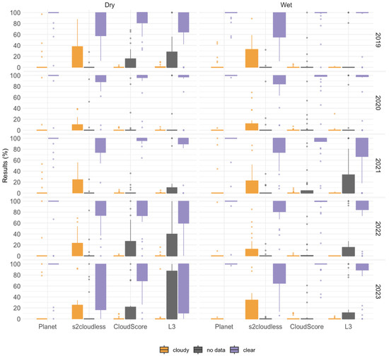 All graphical and statistical analyses were conducted using R software [62]. Box plots were employed to visually represent the distribution of continuous variables, summarizing statistics such as the median, hinges, and whiskers, along with any outlying data points [63]. In these plots, successful cloud removal (“clear” pixels) is depicted in purple, cloud detection errors (“cloudy” pixels) are shown in orange, and missing data (“no data” pixels) are represented in gray.