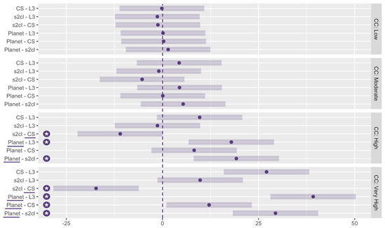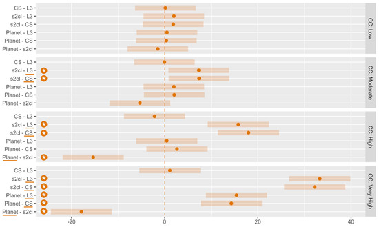 Figure 11 illustrates Tukey’s mean comparisons of the percentage of “no data” pixel occurrences, highlighting both the direction and magnitude of differences between the groups compared. Statistically significant differences are marked with an asterisk, and the mask yielding fewer “no data” pixels is underlined. Under low and moderate cloud cover, no statistically significant differences were observed in “no data” occurrences across the three masks analyzed. When cloud cover is high, significant differences appear only between L3 and s2cloudless, with L3 producing 16.0% more “no data” pixels. In conditions of very high cloud cover, all masks show significant differences, with the largest observed difference being between L3 and s2cloudless, where L3 produces 43.1% more “no data” pixels. Overall, L3 and CloudScore+ are the masks that yield the highest percentages of “no data” pixels under very high cloud cover.