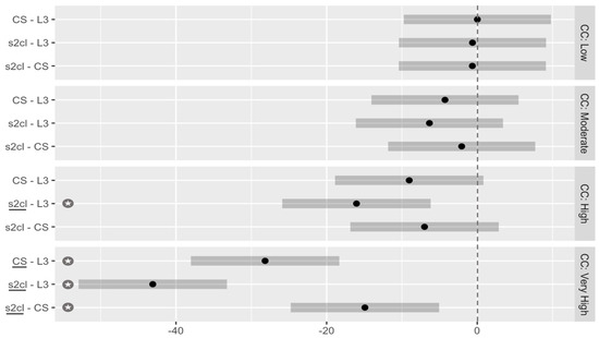 Pairwise comparison of error rates (“cloudy” pixels) across different levels of cloud cover and mask algorithms, using Tukey’s HSD Test. From top to bottom, cloud cover levels are ordered as low, moderate, high, and very high. Statistically significant differences are marked with an asterisk, and the superior mask (indicated by a lower percentage of “cloudy” pixels) is underlined. Abbreviations: s2cl = s2cloudless mask, CS = CloudScore+.