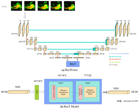 This research introduces ResTUnet, an innovative radar echo extrapolation model that synergistically combines the strengths of the ResT and Unet architectures, along with the strategic use of 1*1 convolution. ResTUnet is designed to address the limitations of traditional radar extrapolation methods, particularly the issue of declining prediction accuracy over time. The Unet architecture, a core component of ResTUnet, features a symmetrical encoding–decoding structure. This structure is pivotal in ensuring efficient information transmission across various layers of the network, thereby significantly enhancing the model’s overall accuracy. The encoding–decoding framework effectively captures and reconstructs the radar data, ensuring that crucial spatial-temporal features are retained and accurately represented. Moreover, the implementation of skip connections in the Unet portion of the model serves a critical role. These connections act as bridges, transferring detailed information directly from the encoding layers to the corresponding decoding layers. This transfer helps in preserving the integrity of the original image’s details, which is instrumental in improving the prediction accuracy of the model. In parallel, the ResT architecture is meticulously integrated into ResTUnet. It incorporates block embedding and position encoding modules, which are essential for effective feature extraction. These modules enhance the model’s ability to accurately identify and process spatial and temporal patterns in radar data, thereby significantly boosting the model’s predictive accuracy. The combination of the ResT architecture with the Unet encoding layer is particularly effective in learning the global features of radar spatiotemporal sequences. This integration addresses a critical shortfall in traditional radar extrapolation methods—the rapid decrease in prediction accuracy over time.