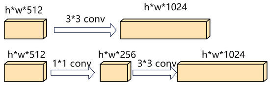More specifically, the application of a 1*1 convolution occurs prior to a 3*3 convolution. This sequence is instrumental in halving the channel number of the input matrix. For instance, without the use of a 1*1 convolution, transforming a feature matrix from a dimension of h*w*512 to h*w*1024 would necessitate a total of 3*3*512*1024 = 4,718,592 parameters for the 3*3 convolutional operation. However, the introduction of the 1*1 convolutional layer leads to a significant reduction in this parameter count. The new calculation, 1*1*512*256 + 3*3*256*1024, amounts to 2,490,368 parameters. This figure represents a reduction of approximately half the original parameter count, as illustrated in Figure 2. Moreover, the inclusion of 1*1 convolutions contributes to an increase in the depth of the network. This increased depth is integral to enhancing the network’s proficiency in capturing and processing a wider array of features.