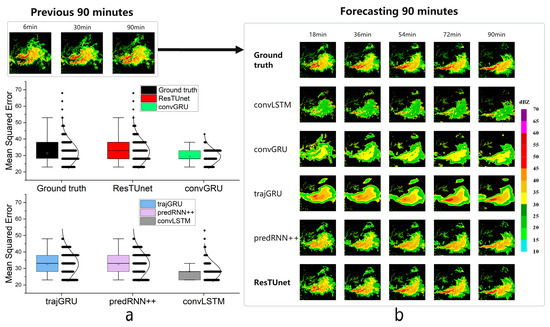 Figure 4 shows the comparison of various indicators between our model and other models with a rainfall threshold of five. From Figure 4, it can be seen that our model’s indicators at each time step are better than those of other models. Specifically, in terms of the False Alarm Rate (FAR) indicator, the curve of our model is flatter than that of other models, indicating that our model is better at capturing global spatial-temporal features than other models. In Figure 6, when the rainfall threshold is 30, our model’s indicators are even better, indicating that our model has a stronger ability to learn high-intensity radar echo features than other models. Figure 7 shows the distribution and frequency of mean squared errors of our model at different thresholds. It can be seen from Figure 7 that the mean squared error of our model remains stable within 0–60 min, while there is a large change between 60–90 min. This indicates that the ResT structure in our model can indeed learn global spatial-temporal features. It can be seen from Figure 7a that our model performs relatively stable when the rainfall threshold is 0, and there are fewer outliers at each time step. This may be because our model more accurately predicts the areas where radar reflectivity is reduced. In contrast, we observed in Figure 7b that the accuracy of our model decreases when the rainfall threshold is five, while it is highest when the rainfall threshold is zero. In Figure 7d, the prediction accuracy decreases more significantly when the rainfall threshold is 30. Nevertheless, relative to other models, our model still exhibits superior prediction accuracy.