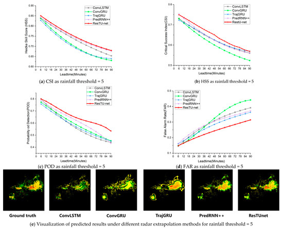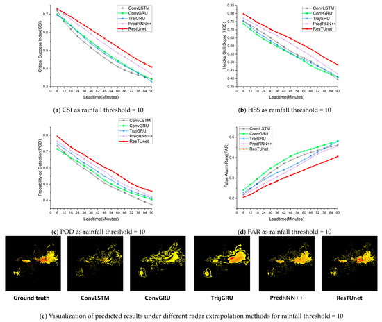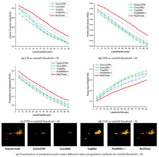 In order to compare the results of different methods, we plotted the CSI, HSS, POD, and FAR curves of all methods within the 0–90 min time range. From Figure 4, it can be seen that, for a rainfall threshold of five, our model improved by 0.29%, 1.08%, and 2.52% for the CSI, HSS, and POD, respectively, compared to the second-ranked model. From Figure 5, it can be seen that, for a rainfall threshold of 10, our model improved by 2.27%, 2.81%, and 2.24% for the CSI, HSS, and POD, respectively, compared to the second-ranked model, while it decreased by 4.78% for the FAR. Finally, from Figure 6, it can be seen that, for a rainfall threshold of 30, our model improved by 17.20%, 11.97%, and 11.36% for the CSI, HSS, and POD, respectively, compared to the second-ranked model, while it decreased by 10.06% for the FAR. Specifically, using the experimental results in Table 2 and Table 3, we calculated the difference in experimental results between the optimal model ResTUnet and the second-best model for different metrics and different rainfall thresholds to determine the percentage improvement in extrapolation performance of ResTUnet relative to that model. For instance, to determine the 17.20% improvement in the CSI metrics for ResTUnet compared to the PredRNN++, we first calculated a 4.28% enhancement in the CSI metrics for ResTUnet. We then express this improvement (4.28%) as a percentage of the CSI result from the PredRNN++ (24.88%), which leads to an overall improvement of 17.20%.