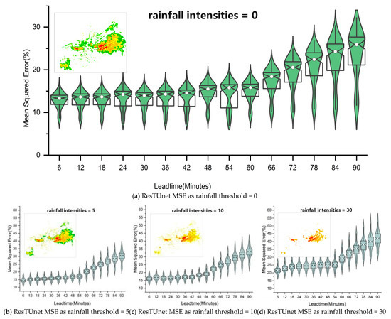 In addition, Figure 7 shows the change in the mean square error of the ResTUnet model over time under different rainfall thresholds. This indicates that, in the cases where R = 0 and R = 5, the mean square error remains stable within the 0–60 min period (about 15%), while, in the case of R = 10, it remains stable during this time frame (about 17%). In the case of R = 30, the error remains relatively stable in the 0–60 min period (about 23%). In all cases, the mean square error starts to increase only after 60–90 min. Overall, our model exhibits the most gradual changes across all curves, which suggests that our proposed approach successfully captures the global features of the radar echo spatiotemporal sequence and addresses the issue of fast decline in the prediction accuracy of radar extrapolation techniques as time increases.