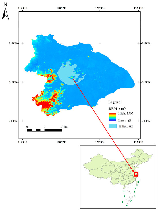 The geographical location of Taihu Lake is shown in Figure 1, with the image coordinate system being GCS_WGS_1984. Taihu Lake is one of the five largest freshwater lakes in China, located between southern Jiangsu Province and northern Zhejiang Province, spanning areas such as Suzhou, Wuxi, and Changzhou. The lake [40] covers an area of 2427.8 square kilometers, with a water surface area of 2338.1 square kilometers and a shoreline length of 393.2 km. The western and southwestern sides are hilly and mountainous, while the eastern side is primarily plains and water networks. Situated in the subtropical zone, the climate is mild and humid, characterized by a monsoon climate. In recent years, environmental issues in Taihu Lake have drawn widespread attention, particularly water pollution caused by agricultural runoff, industrial pollution, and urban expansion. The main pollution problem is eutrophication of the lake.