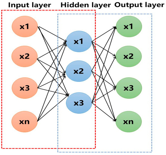 The autoencoder [46], as a type of feedforward neural network, aims to minimize the difference between its output and input values through the backpropagation algorithm. Typically, an autoencoder consists of an input layer, hidden layers, and an output layer, with the network structure depicted in Figure 2. The dimensions of the input and output layers are the same as the dimensions of the input data. The specific principles are represented by Equations (1) and (2):