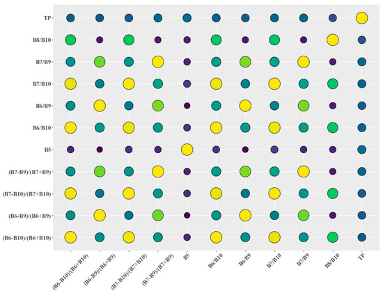 Figure 3 illustrates the correlation magnitudes between the top 10 spectral features most correlated with total phosphorus (TP) concentration. As depicted in Figure 3, there is a positive correlation between TP concentration and the generated spectral indices. The top 10 spectral indices with the strongest correlation to TP concentration are chosen for subsequent model construction and analysis. The final selection of these 10 spectral features is presented in Table 3. An F-test was conducted on the ten bands mentioned above, and the results show that the p-values for each band are all less than 0.05, indicating that their correlation with total phosphorus is significant and that they can be used as input data for the subsequent multilayer denoising autoencoder model.