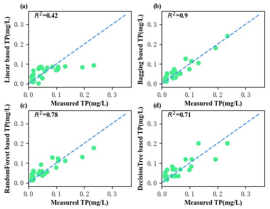 Plots of the observed versus retrieved total phosphorus concentrations when applying the different models to the testing dataset: (a) linear model, (b) bagging model, (c) random forest model, and (d) decision tree model.