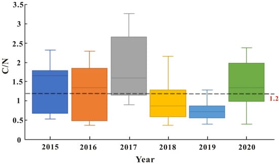 Box plot of C/N values in the decomposition regions from 2015 to 2020.