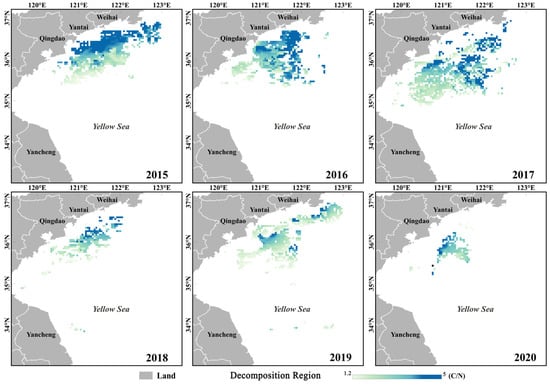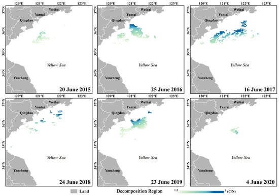 This is due to significant interannual differences in the initial biomass of green tides, which are further amplified regarding peak biomass and the duration of algae presence in various growth environments [39,40]. However, relying solely on the C/N ratio from the same year is unsuitable for identifying decomposition regions across interannual periods. The primary reasons are as follows.