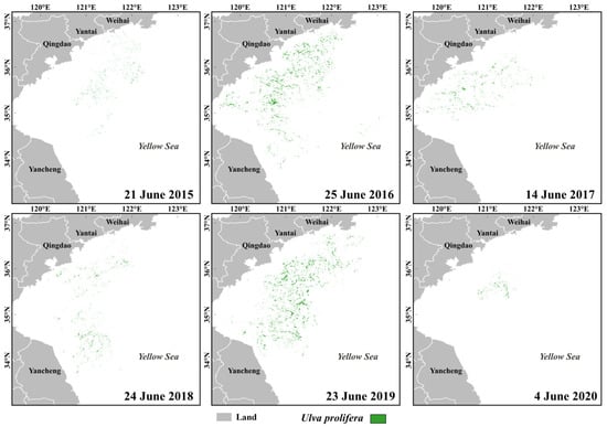 Spatiotemporal distribution map of the daily maximum green tide area from 2015 to 2020.
