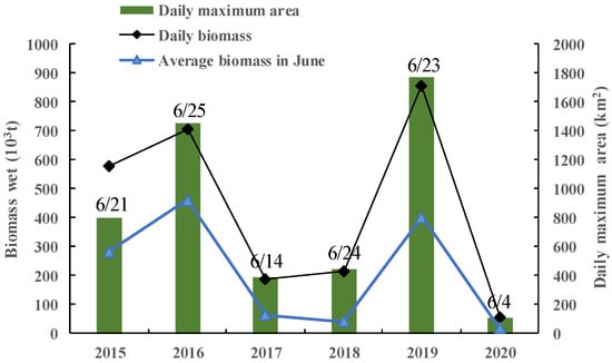 Statistical chart for the daily maximum green tide area and biomass from 2015 to 2020.