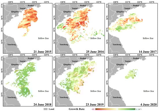 Growth rates for the daily maximum green tide area from 2015 to 2020.