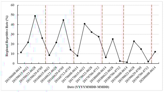 This study validates the newly developed DRIM using a publicly available dataset on green tide coverage. The dataset, provided by the Marine Science Data Center of the Chinese Academy of Sciences (https://msdc.qdio.ac.cn/data/, accessed on 11 November 2024), primarily consists of daily green tide coverage data of the Yellow Sea, derived from cloud-free MODIS optical images with a resolution of 500 m. First, the daily green tide coverage data from 2015 to 2020 were resampled and aligned to a unified grid system. Next, changes in the green tide area were calculated at 7-day intervals, and grid cells with negative green tide growth were selected. Finally, the decomposition regions identified by the method during the same time intervals were compared to regions with negative green tide growth, and the repetition rates were calculated, as shown in Figure 9.