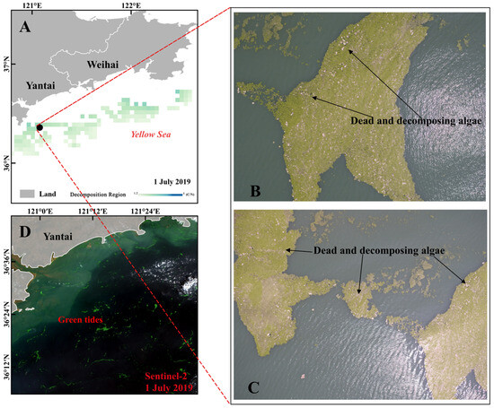 Floating green tides captured by a UAV on 1 July 2019. (A) Spatial and temporal distribution of green tides, including the recording spot of the UAV; (B,C) UAV images of floating green tides. Black arrows indicate dead and decomposing green algae, appearing yellow–green or even whitish; (D) Sentinel-2 true color composite of the study area recorded on 1 July 2019.