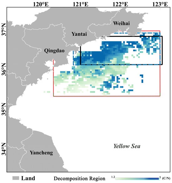Based on the results from Table 2 and Figure 3, the average value of the key biochemical factor (C/N) in the green tide algal decomposition process for areas meeting the method’s prerequisites is 1.2. Given that remote sensing data with a grid resolution of 1 × 1 km is used as a substitute for the key C/N factors, the multi-year C/N mean value of 1.2 is more suitable than the interannual threshold for identifying decomposition regions of green tides.