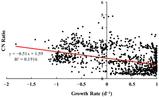 Correlation between C/N values and the growth rate of green tides. Values are extracted from the decomposition regions.