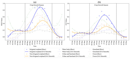 NDVI (a) and EVI (b) time-series smoothing results for different land cover.