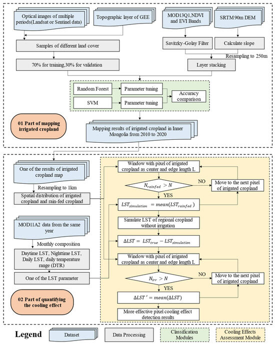Flowchart of the study. The flow of the study was divided into two parts: part 1 focused on mapping irrigated cropland, and part 2 focused on assessing the cooling effects.