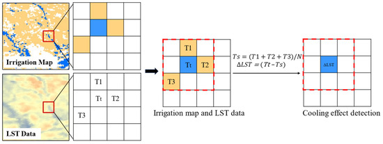 We employed a moving window-based method for detecting the cooling effect [14]. This method assumes a consistent climatic background within a certain range of windows and quantifies the cooling effect of irrigated cropland by comparing the LST of irrigated cropland with that of rain-fed cropland. Unlike approaches that adjust window size to increase the number of effective image elements, our method achieves this by reapplying the moving window. The exact procedure is as follows.