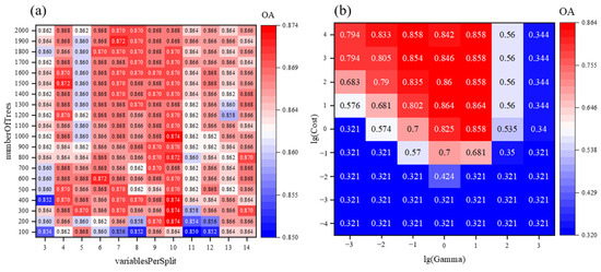 We evaluated the classification performance of RF and SVM with different parameter combinations in terms of overall accuracy (OA) metrics to ensure the best classification results. The difference in OA obtained for different parameter combinations of RF was small. As shown in Figure 6, the highest OA (0.874) was achieved when number Of Tree = 1000 and variablesPerSplit = 10. In contrast, the OA for SVM varied considerably with different parameter combinations, with the highest OA (0.864) obtained when Gamma = 1 and Cost = 10. The comparison of the two machine learning algorithms indicated that RF produced more stable results, while SVM showed fluctuations in performance across the configuration. Furthermore, RF with optimized parameters outperformed SVM in terms of OA, making it the preferred algorithm for this study.