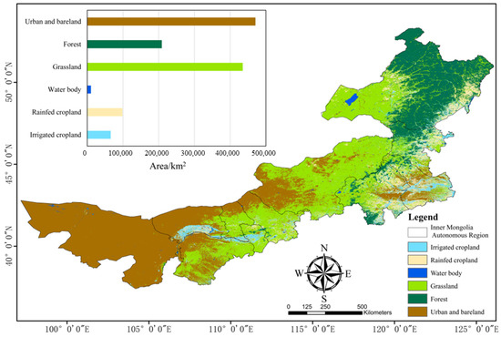 The spatial distribution of land use in Inner Mongolia in 2020 is shown in Figure 8. The spatial distribution of land use from west to east is roughly divided into bare land, grassland, and forest land, with scattered distribution of urban, cropland, and water bodies. Bare land and urban are the most widely distributed in the Inner Mongolia, with a total of 470,862.66 km2. Bare land is primarily located in the western part of the study area, with scattered occurrences in the southeast. This is followed by grasslands with a total of 435,133.99 km2, mainly in the central and southeastern part of the study area. Inner Mongolia has 208,768.12 km2 of forest, mainly in the northeast.