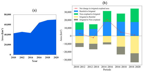 Changes in the area of irrigated cropland from 2010 to 2020. (a) Trends in irrigated cropland area. (b) Transfers in and out of irrigated cropland area and net changes in different periods.