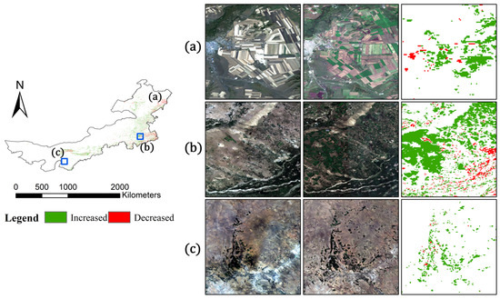 Changes in irrigated cropland in Inner Mongolia from 2010 to 2020. (a–c) Representative regions of three irrigated cropland expansions, with true-color images of Landsat-5 in 2010 and Sentinel-2 in 2020.