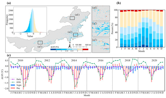 Through quantitative analysis of the cooling effect of irrigated cropland in Inner Mongolia, we found that the LST of irrigated cropland was generally lower than that of rain-fed cropland, exhibiting diurnal, seasonal, and interannual differences. Based on multi-year data from 2010 to 2020, the average daily cooling effect of irrigation was −0.25 °C. Most irrigated cropland (74.24%) experienced a cooling effect, while 25.76% of irrigated areas exhibited a warming effect (Figure 11a). The cooling effect of irrigated cropland peaked in July and August (−0.64 °C), coinciding with the peak growing season when irrigation demand was highest due to elevated LST and increased evapotranspiration (Figure 11b). Outside of the growing season, the LST difference between irrigated and rain-fed cropland was significantly reduced, with a mean ΔLST of −0.12 °C ± 0.03 °C from October to April.