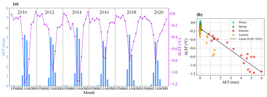 Further experiments showed that the cooling effect of irrigation and evapotranspiration are strongly correlated. ΔET was calculated using the same moving window approach as that for ΔLST. Results indicate that ΔET and daily ΔLST exhibit highly correlated time-series trends. From June to September, when ΔET was highest, the irrigation cooling effect was also strongest (Figure 12a). Mapping the time-series trends onto a scatterplot revealed that irrigation-induced decreases in LST and increases in ET primarily occurred during summer and some autumn months. Additionally, ΔLST and ΔET exhibited a highly linear relationship, with an R2 of 0.85 (Figure 12b). Higher LST leads to increased evapotranspiration, and irrigation further enhances evapotranspiration, thereby mitigating surface temperature rise. These findings underscore the potential of irrigation to mitigate climate change risks.