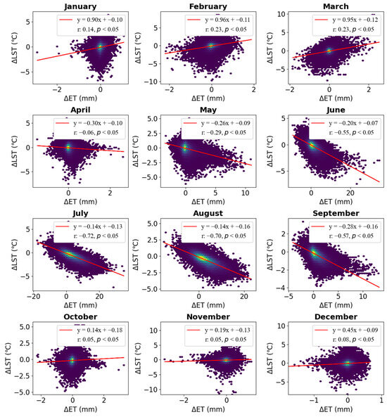 Monthly correlation analysis between ΔLST and ΔET showed significant correlations for all months (p < 0.05). However, a strong negative correlation (Pearson correlation coefficient < −0.5) was observed only from June to September (Figure 13). For other months, while the correlation was weaker, the p-value remained significant due to the large sample size. These results highlight that the cooling effect of irrigation is most pronounced during the summer growing season, with evapotranspiration playing a key role in regulating LST during this period.