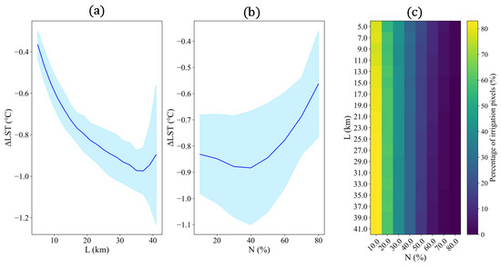 Sensitivity analysis for different combinations of L and N parameters. (a,b) Effects of different L and N parameters on the results of the quantification of the cooling effect. (c) Proportion of pixels of irrigated cropland detected under different combinations of parameters.