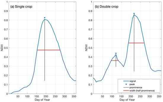 Using the aforementioned calibration data as a basis, we carefully analyzed the peak detection results and their connection to single and multiple cropping systems. For certain time-series, we identified smaller peaks that did not correspond to actual crop growing seasons. To improve our peak detection techniques, we evaluated additional criteria such as peak width and prominence, as illustrated in Figure 2. Peak width is important as it directly corresponds to the crop growing cycle while peak prominence has a lesser impact on improving the accuracy of distinguishing between single and multiple cropping. For example, a peak width of more than 30 days (equivalent to approximately four 8-day MODIS composites) was found to be necessary to represent a crop growth cycle, ensuring the NDVI signal accurately reflects the phenological stages of crop development. The calibration data facilitated the examination of various peak widths to identify the optimal settings for accurate crop cycle representation.
