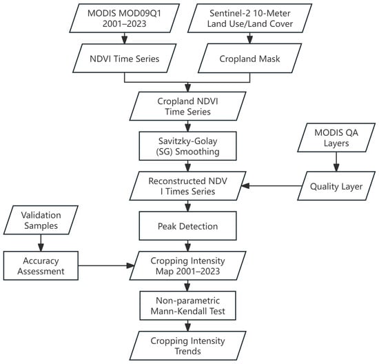 The annual single/multiple crop mapping results from 2001 to 2023 were used to support the long-term crop intensity change analysis. For each mapping year, single and multiple cropping patterns were encoded as 1 and 2, respectively, for each 250 m MODIS pixel. To approximate crop intensity, average values were computed within 3 km by 3 km moving windows. Long-term trends in crop intensity from 2001 to 2023 were then analyzed on a window-by-window basis using the non-parametric Mann–Kendall test, which is well-suited for environmental data as it does not assume a specific distribution. For 3 km × 3 km grids with significant trends, Sen’s slope estimator was applied to determine the direction and magnitude of these trends. Positive or negative trends in crop intensity were identified based on Sen’s slope results, highlighting areas with significant increases or decreases in cropping intensity over the 23-year period. This approach allowed us to pinpoint specific areas where crop intensities were either rising or declining.