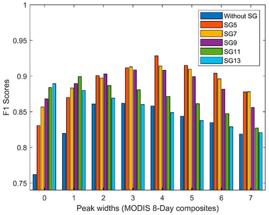 For SG filter window sizes ranging from five to eleven on MODIS composites, F1 scores increased and then decreased as the peak width criterion was adjusted from zero to seven. The optimal F1 scores were achieved with a peak width threshold of three to four MODIS composites (equivalent to 24–32 days). Peaks with a duration shorter than 24 days typically do not reflect genuine crop growth cycles. Utilizing an excessively broad peak width threshold, such as seven 8-day MODIS composites, poses the risk of overlooking narrower peaks. This oversight could result in the misclassification of areas with multiple cropping cycles as having only a single crop cycle. Moreover, employing wider SG filter window sizes, such as 13, resulted in diminished peak detection accuracy compared to the outcomes from narrower window sizes. This drop in accuracy was particularly notable when broader peak width criteria were applied.