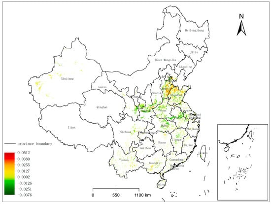 Slope coefficient (change rate) of cropping intensity trend model (2001–2023). Note only 3 km windows showing significant (p < 0.05) upward/downward trends based on the Mann–Kendall test were used for trend model development.