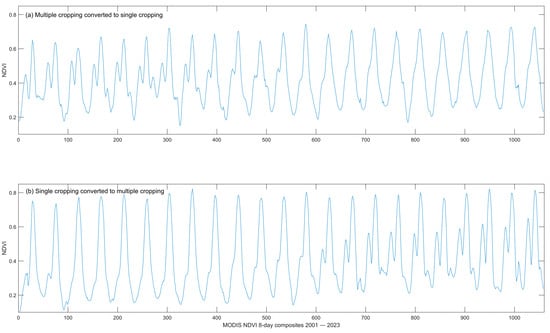NDVI time series from 2001 to 2023 for two selected 3 km analytical windows: (a) areas transitioning from multiple to single cropping practices, and (b) areas transitioning from single to multiple cropping practices. NDVI values were averaged for all cropland pixels within each 3 km window for every MODIS composite.