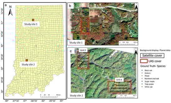 (a) Location of site 1 and site 2 within the State of Indiana. (b,c) Satellite data extent and location of field surveys in 2021 (points) displayed on Planet data for Plot 4D at site 1 and units 3 and 4 at site 2. Red box—RPA data capture in 2020 for site 1 and 2021 for site 2.