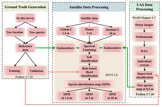 The general workflow contains three essential steps. Reference data collection using field surveys, supervised classification of RPA data to create a reference map, and spectral unmixing of satellite data (using in situ measurements and the RPA reference map) followed by a hard classifier. SDM stands for species distribution map. Red arrows represent training and validation used for classification while green arrows indicate reference data (from the ground truth data and the RPA species map) used for generating endmembers.