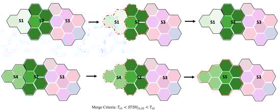 Finally, a local threshold ( was calculated for each segment using the base threshold and homogeneity function, , because a homogeneous segment has a higher threshold and is likely to be merged with neighboring segments. To determine the segments that need to be merged, the spectral proximity or distance of the merged segment was compared with its neighboring segments, and the segment with a change smaller than the threshold (was merged (Figure 4) as follows: