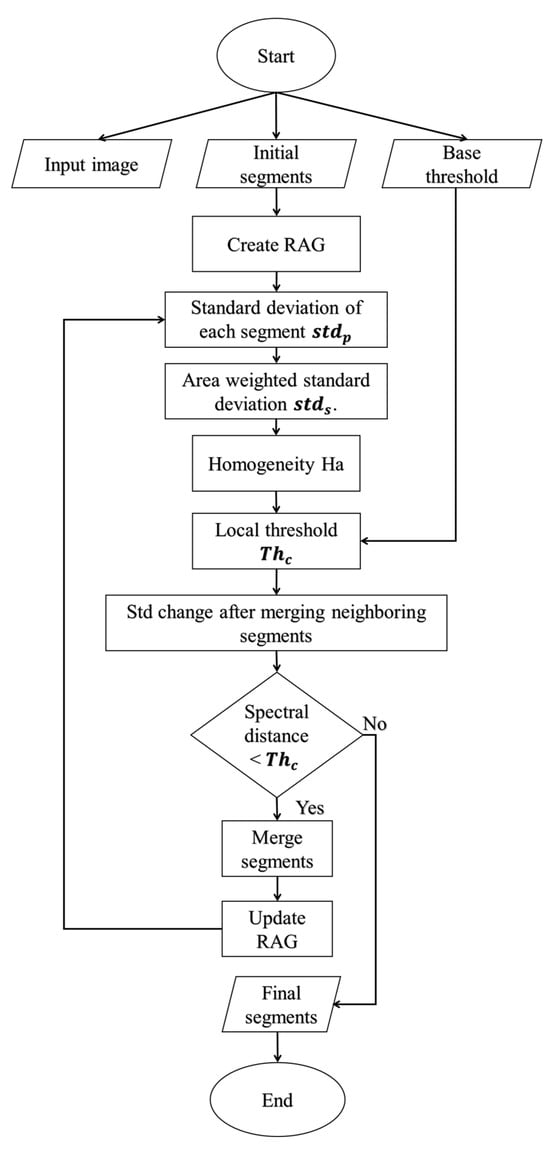 Finally, RAG was updated, and the steps above were repeated until the spectral distance between all segments exceeded the local threshold (Figure 5).