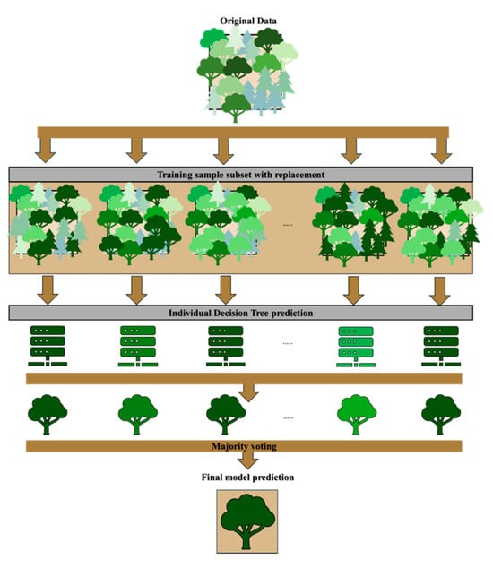 A Random Forest (RF) classifier is a non-parametric classifier with multiple embedded Decision Trees []. Each Decision Tree (DT) performs a vote on the class prediction and the highest-voted class among all of the trees becomes the overall model class prediction (Figure 6). Random Forest is a popular classifier in remote sensing applications, especially for forest species mapping. The popularity of the model is attributed to achieving good performance over complex and higher dimensional datasets while having ease of implementation. The RF classification does not have any data distribution assumptions, thereby providing a better model fit without overfitting even with lesser input variables. Immitzer et al. (2019) [] utilized an RF classifier on high-resolution satellite data (Worldview 2) to classify different conifer species and noted the effectiveness of the RF classifier for conifer species differentiation.