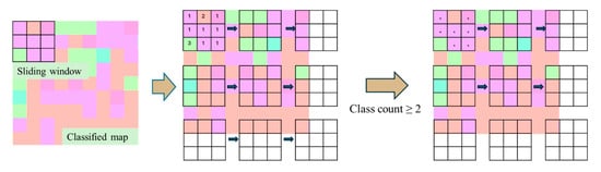 where is the pixel count for each class, i, within the specified window. This condition was utilized corresponding to the nature of our problem related to tree species distribution and area characteristics. In order to minimize the confusion between classes and improve class separability, the moving window was padded with a single pixel buffer to exclude the edge pixel class. The window size and the condition can be customized according to the nature of the problem (Figure 7). For example, when looking at broader species types or identifying forest class among other types, the window size as well as the count condition can be increased to collect distributed reference samples.