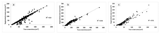 Relationship between the segmented and true crown areas in cm2 for (a) site 1, (b) unit 3, and (c) unit 4 at site 2.