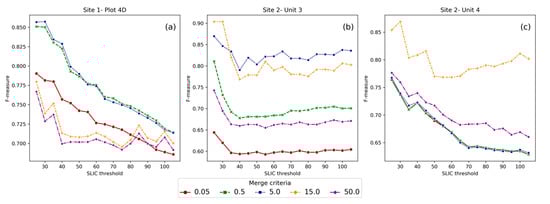 Variation in F-measure values based on different SLIC and merge thresholds for (a) Plot 4D at site 1 and (b) unit 3 and (c) unit 4 at site 2.