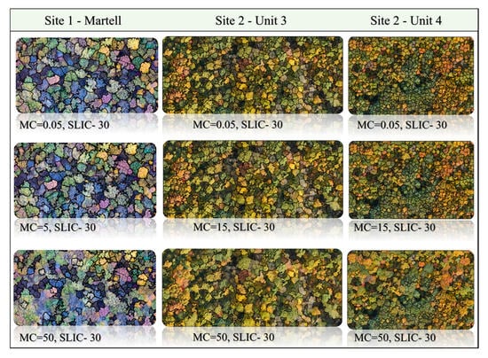 As indicated by the highest F-measure (Figure 9a), it can be observed that an SLIC threshold of 30 and a merge criteria of 5 produced the best segmentation accuracy (F-measure = 0.87) for site 1. For units 3 and 4 at site 2 (Figure 9b,c), it can be observed that a SLIC threshold of 30 and a merge criteria of 15 resulted in a superior crown segmentation (F-measures of 0.91 and 0.88). The general trend of varying different SLIC thresholds indicated that the best segmentation results were obtained at a smaller threshold for initial SLIC segmentation and the segmentation accuracy decreases as the SLIC threshold is increased.